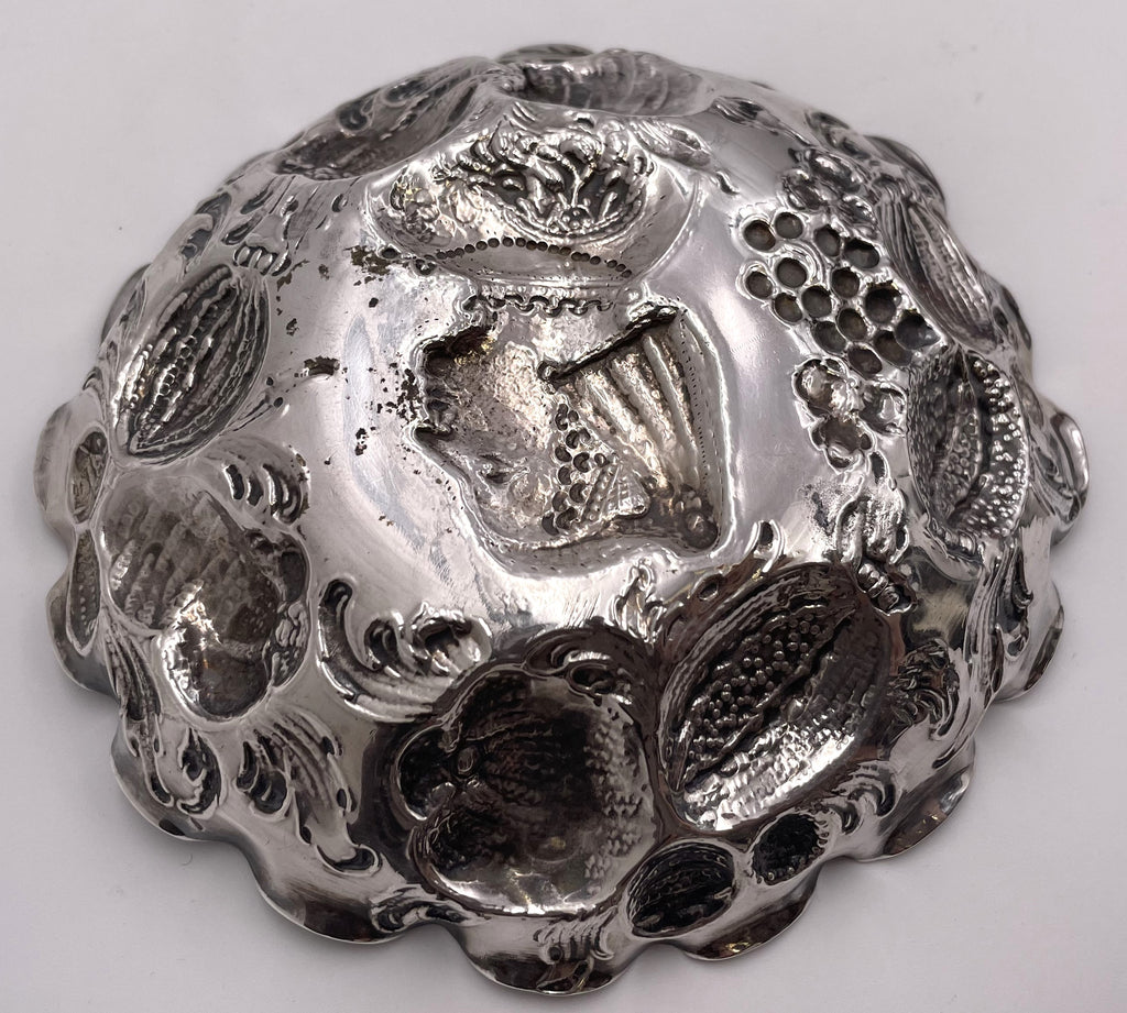19th century, continental silver sweet meat dish in Augsburg/ Nuremberg style, with beautiful natural motifs and the profile of a woman. It measures 5 1/2'' in diameter by 1'' in height and weighs 3.5 troy ounces.