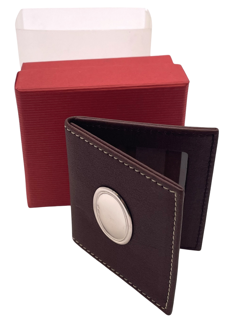 Cunill leather holder for 2 photographs, with a sterling silver applied oval motif. It measures 2 3/4'' by 2 1/2'' and is sold new in its original box.
