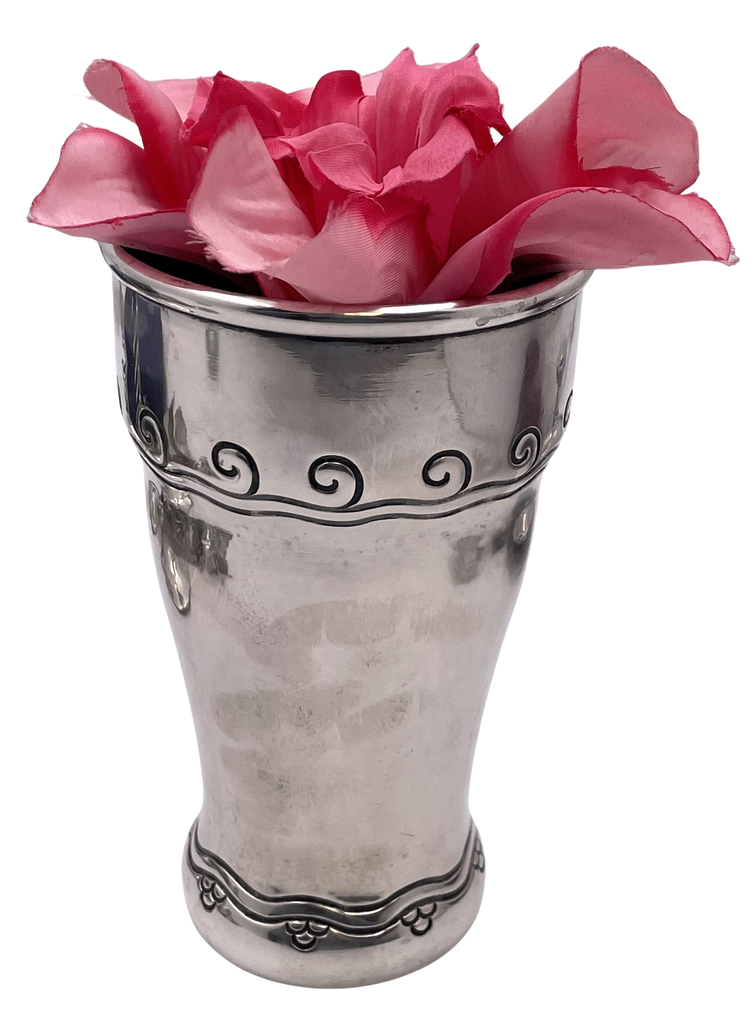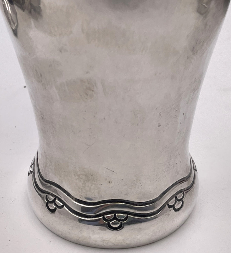 Danish silver vase, beautifully hand-hammered, with an elegant, geometric design, the body and based adorned with stylized geometric motifs. It measures 7'' in height by 4 1/4'' in diameter at the top, weighs 8.5 troy ounces, and bears hallmarks as shown.