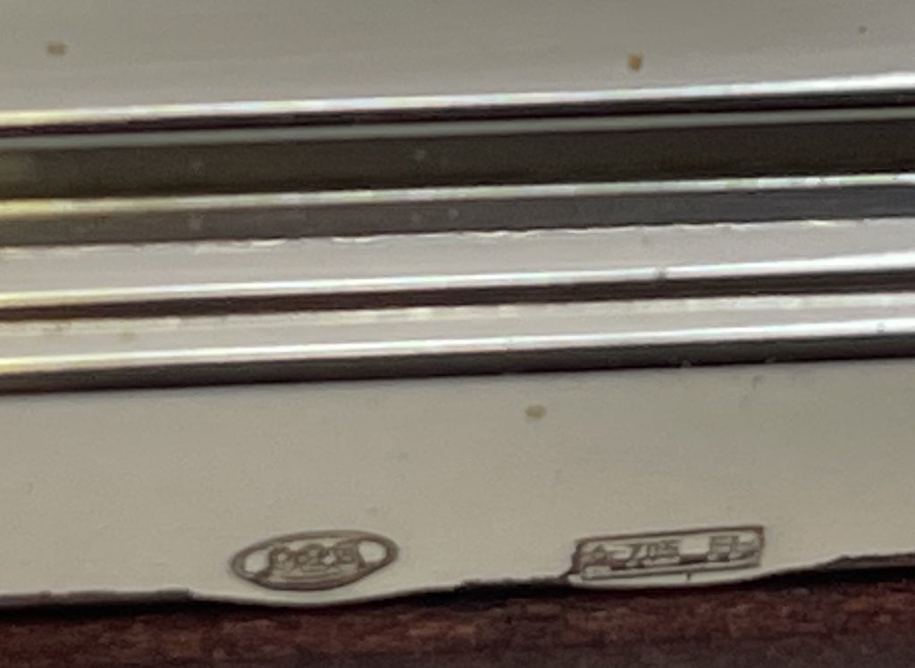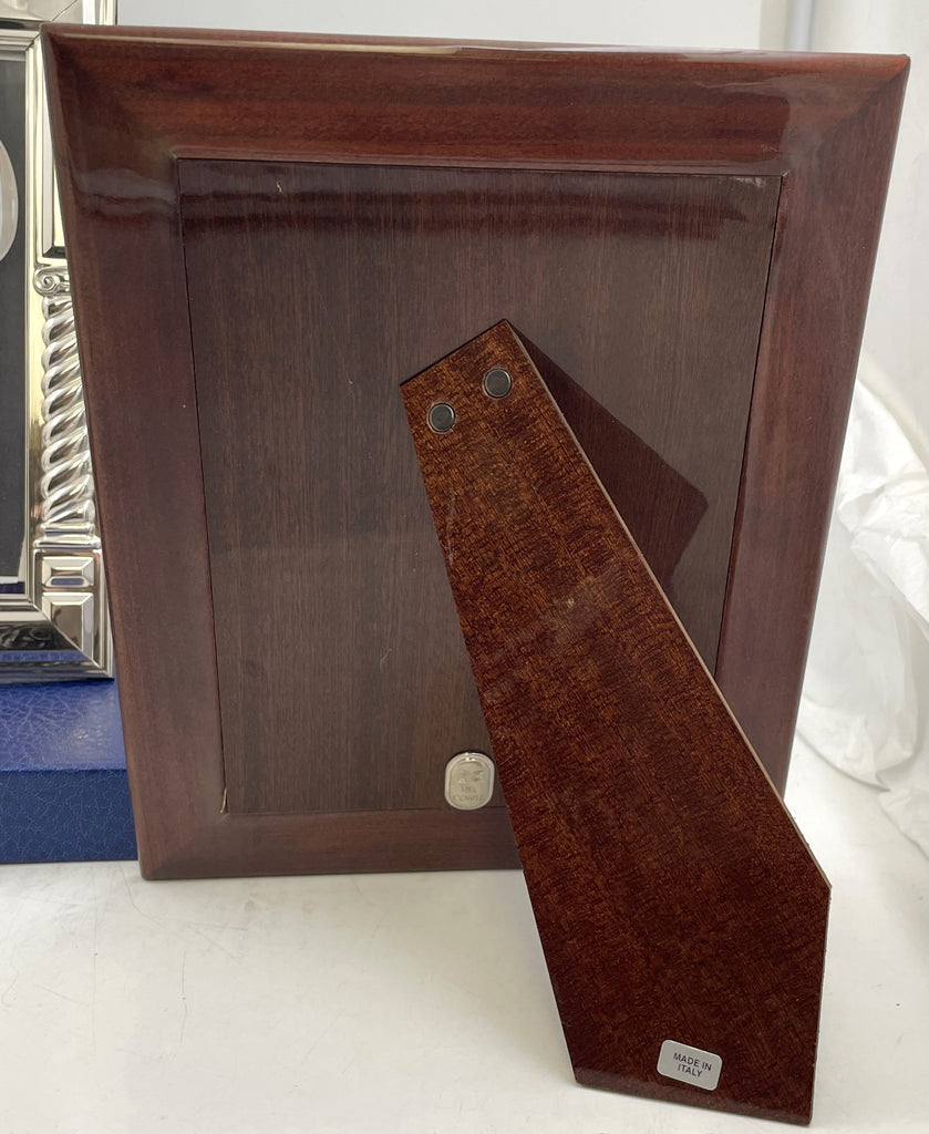 Del Conte sterling silver picture frame with glass and wood back measuring 9 1/2'' by 7 1/2'' in outer dimensions (picture size is 5'' by 7''). Brand new.