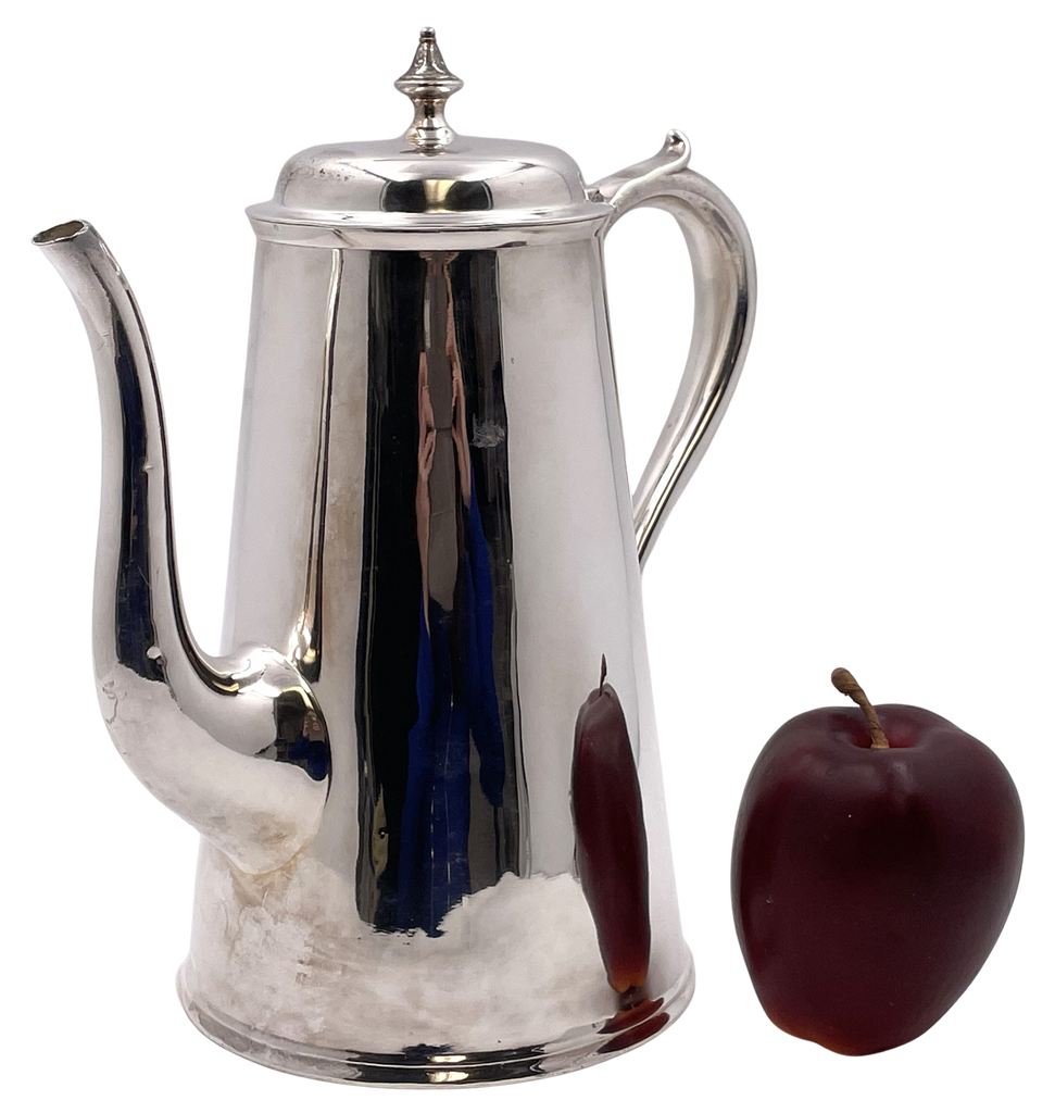 Elkington & Co. silverplate coffee pot, in an elegant, geometric design. It measures 11 1/3'' in height by 9 1/2'' from handle to spout and bears hallmarks as well as its original price tag as shown.