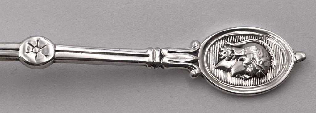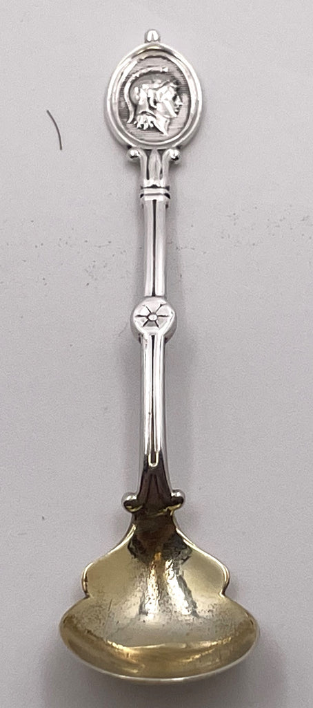 J. E. Caldwell & Co. sterling silver salt spoon in the celebrated Medallion pattern from the mid-19th century with a gilt wash bowl. It measures 3 1/2'' in length and bears hallmarks as shown.