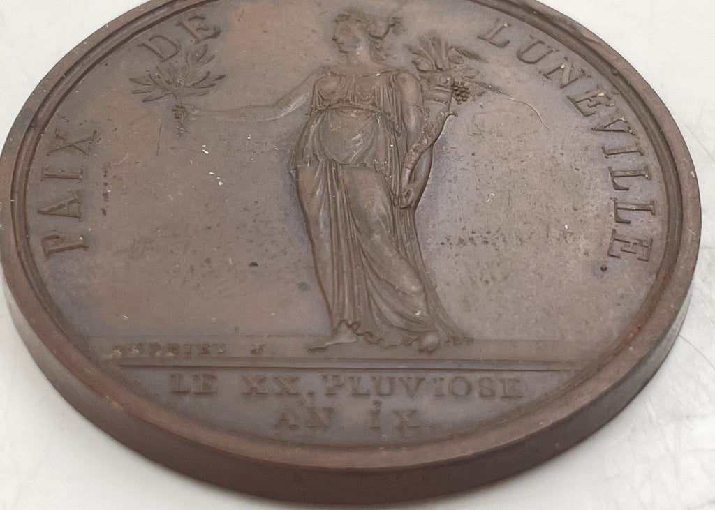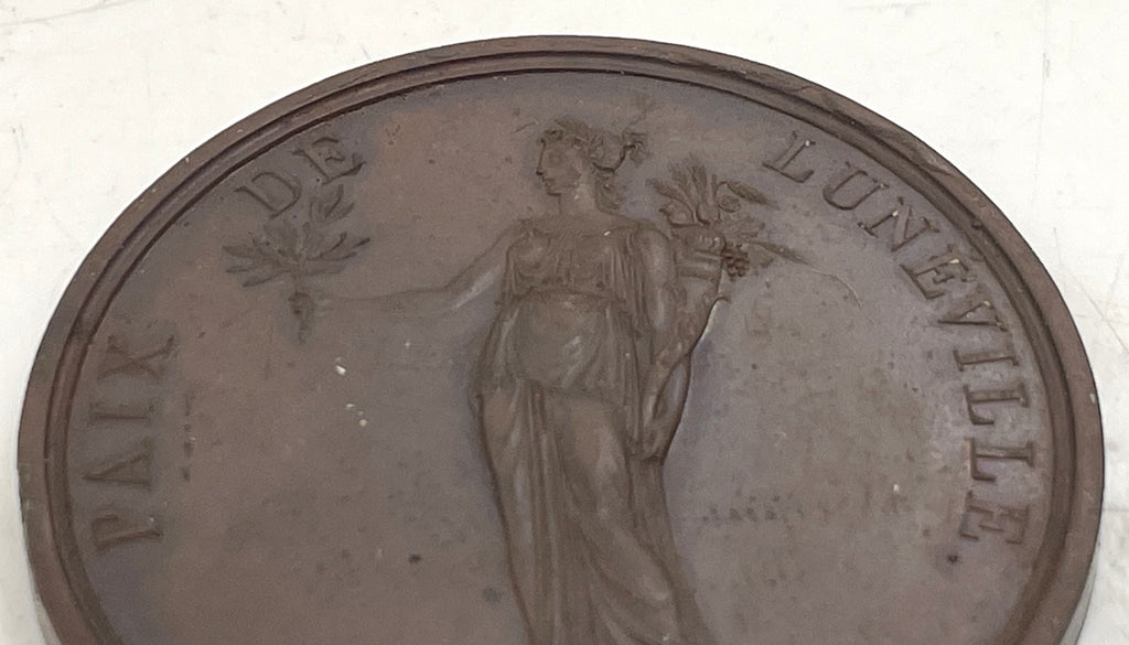 Bronze medal from 1801 commemorating the Treaty of Lunéville, signed between France and the Holy Roman Empire, marking the end of hostilities in the War of the Second Coalition and solidifying Napoleon's diplomatic and military dominance, paving the way for his eventual rise as Emperor of the French. At the time, he was first Consul of France and is shown as such on the medal. It measures 42 mm in diameter (1 2/3'') by 3 mm in height (1/8'' in height) and is in very good condition.