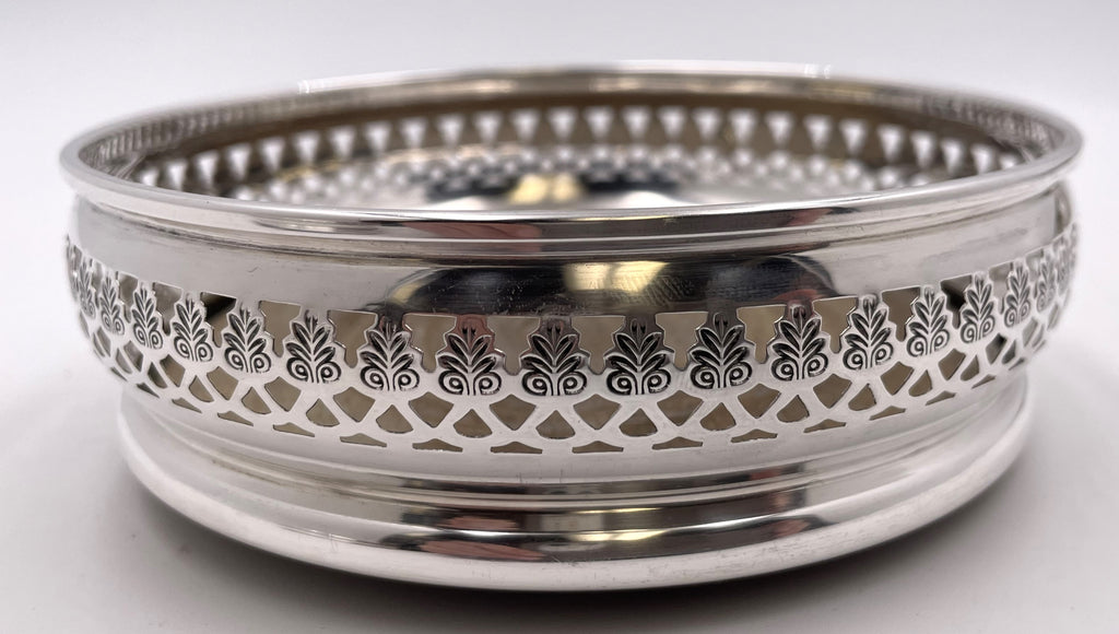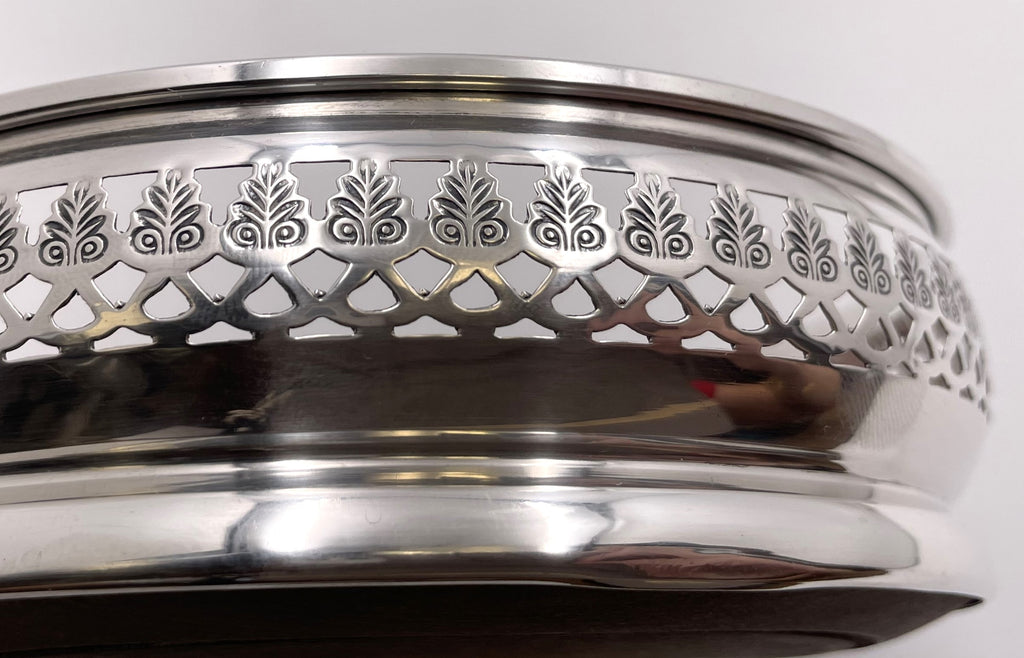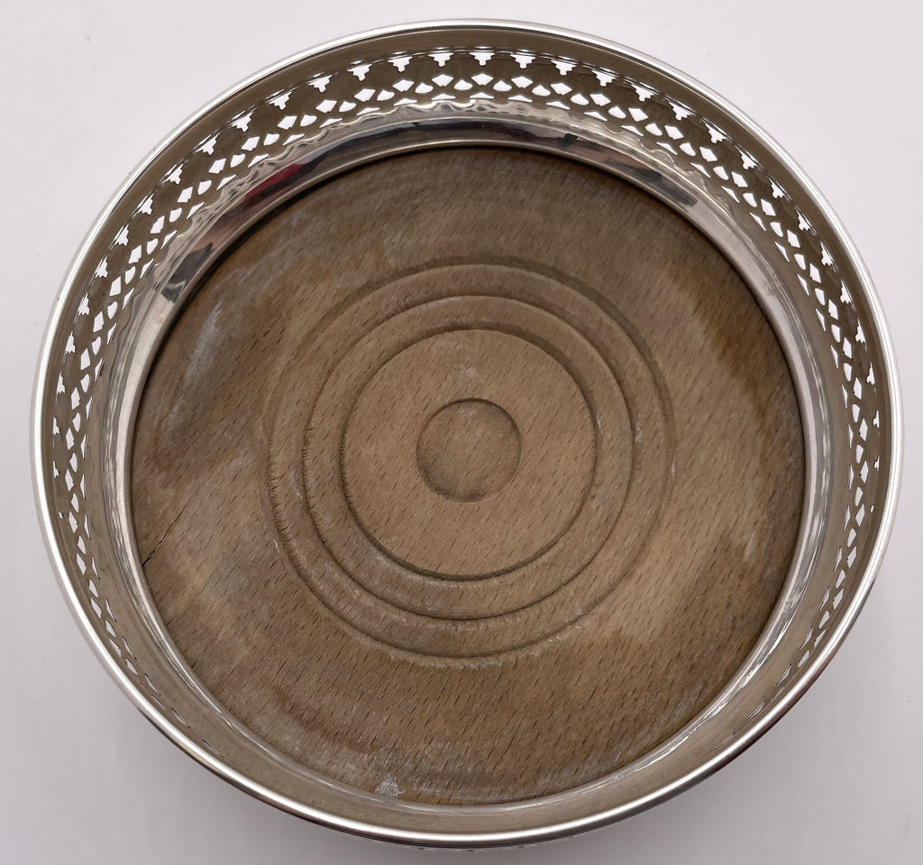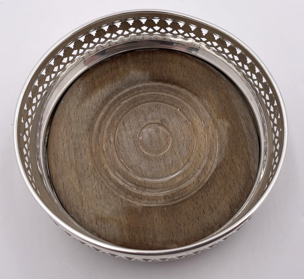 Pair of English sterling silver and wood coasters, made in London in 1969, with pierced geometric motifs. They measure 5 1/2'' in diameter by 1 2/3'' in height and bear hallmarks as shown.