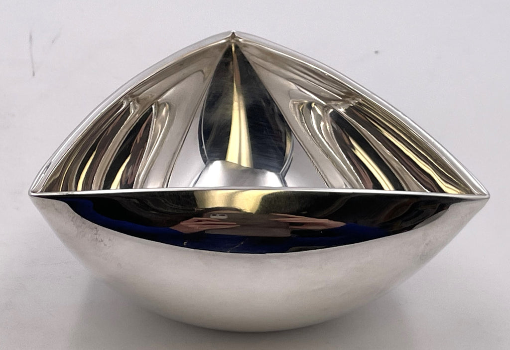 Pampaloni silver plate bowl in Mid-Century Modern style, with an elegant, geometric design. It measures 5'' by 4'' by 2 1/2'' in height and bears hallmarks as shown.