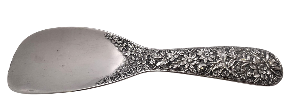 S. Kirk & Son sterling silver shoehorn in repousse pattern, with ornate floral and natural motifs adorning the handle, from the early 20th century. It measures 6 1/2'' in length by 1 2/3'' in width by 2/3'' in height, weighs 2.8 troy ounces, and bears hallmarks as shown.