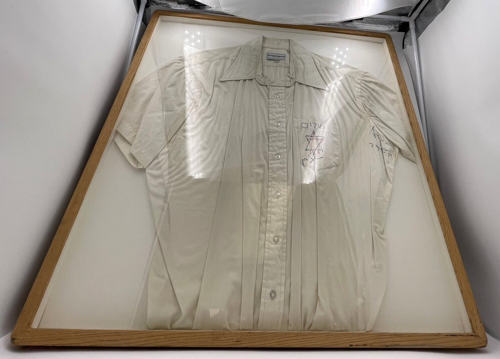 Unique Yaacov Agam shirt (signed and dated) with a Star of David. The framed dimensions are 28 1/2'' by 30 1/2''.