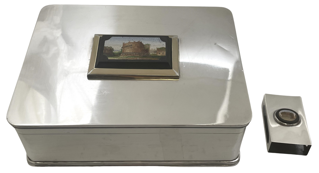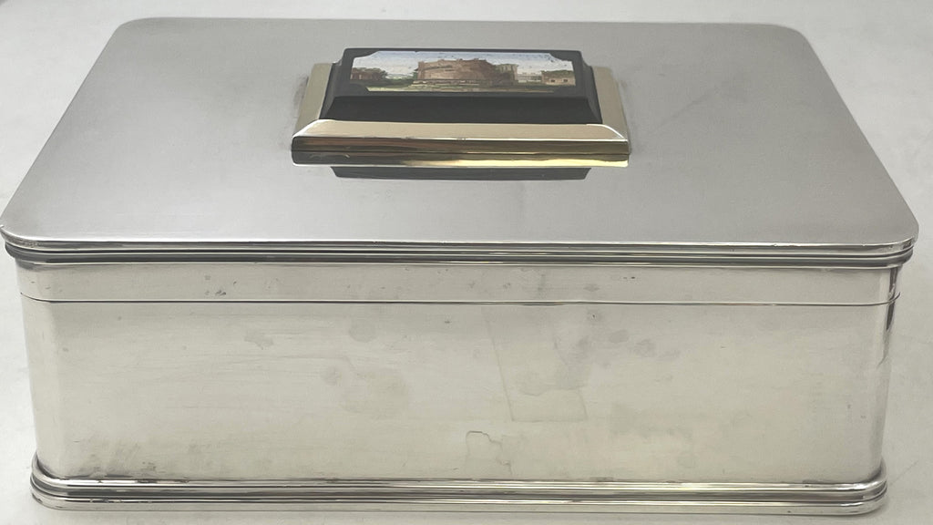 Italian sterling silver humidor or cigar box, adorned with a micromosaic on top depicting the Colosseum and Roman Forum, partially gilt around the edge of the micromosaic, in an elegant, geometric design. It measures 8'' by 6 1/8'' by 3'' in height.