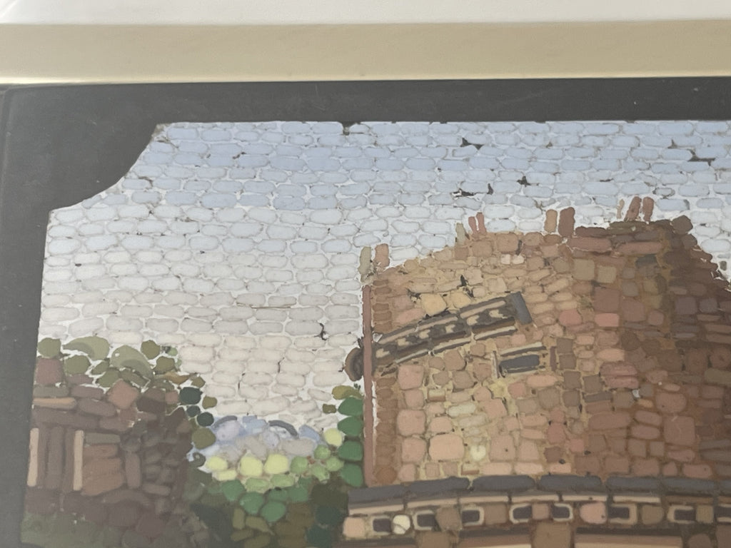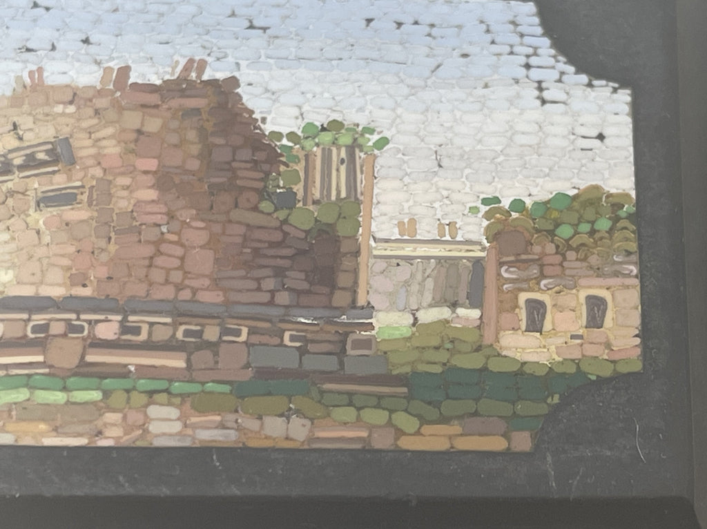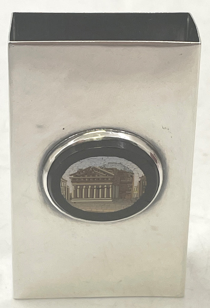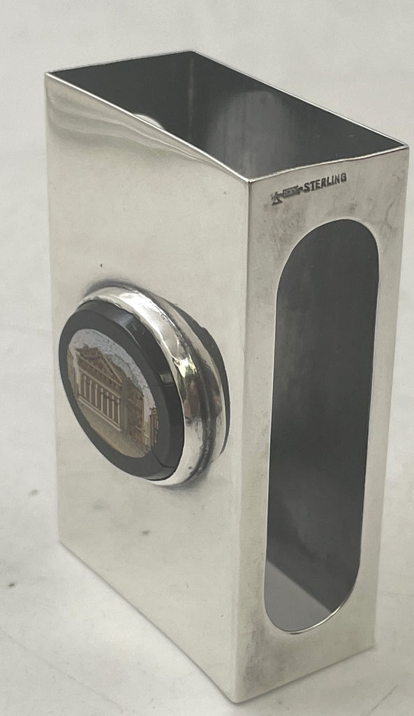 The matchbox holder was made by the American silversmithing firm, Kerr, and depicts the Pantheon of Rome on the micromosaic. It measures 2 1/2'' in height by 1 1/2'' in width by 3/4'' in depth.