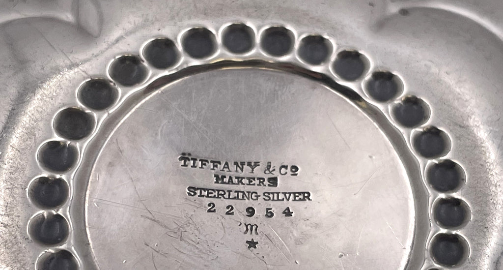 Tiffany & Co. sterling silver nut dish or bowl in pattern number 22954 from 1941 with a floral, multilobed design. It measures 5'' in diameter by 1 1/8'' in height, weighs 4.8 troy ounces, and bears hallmarks as shown.