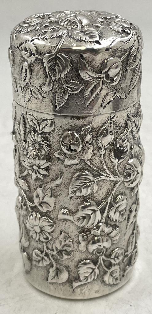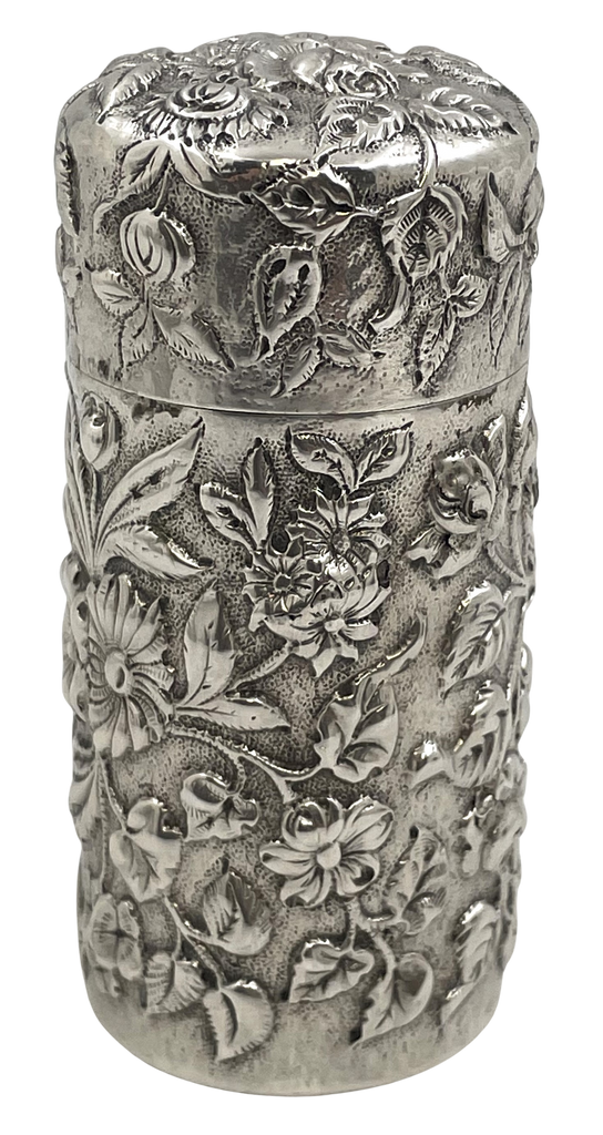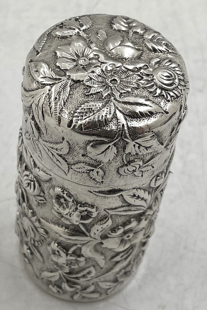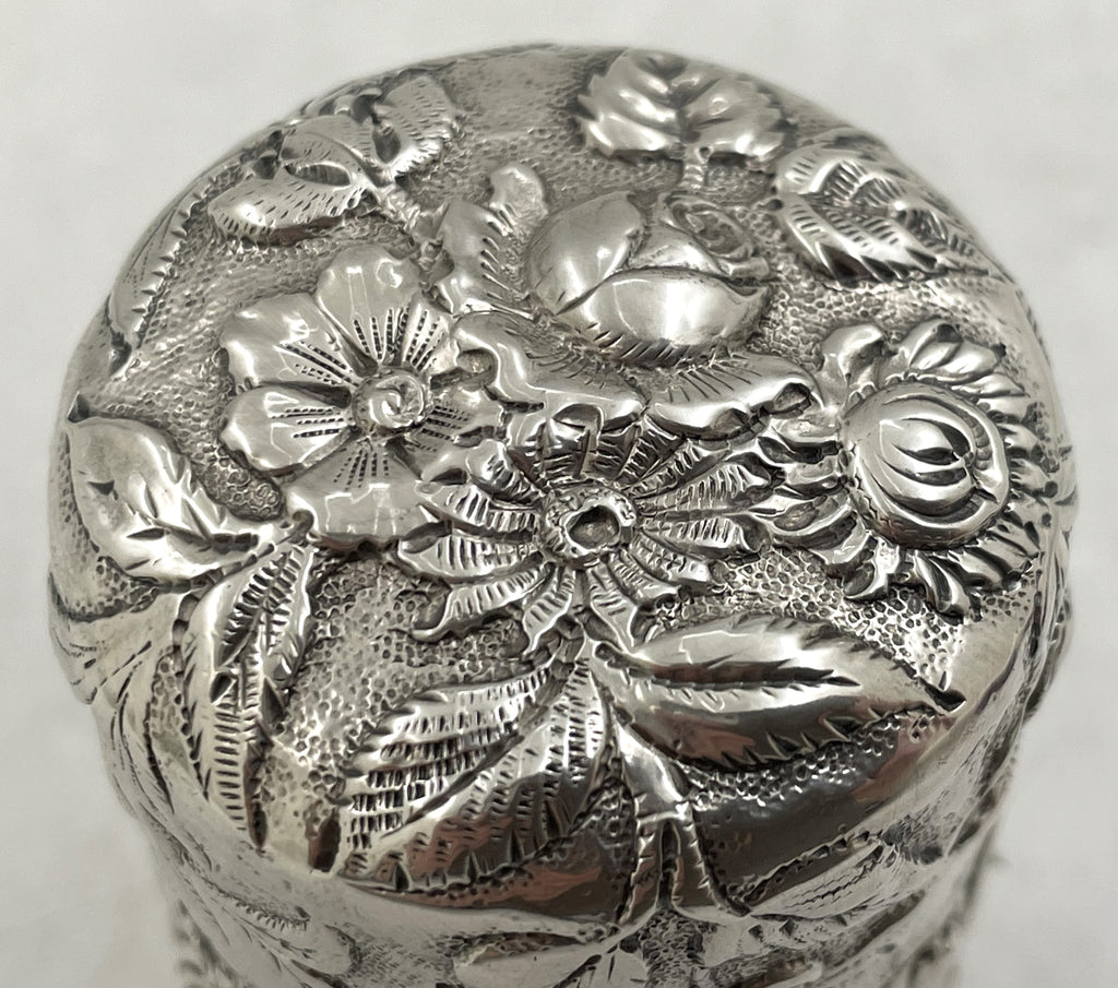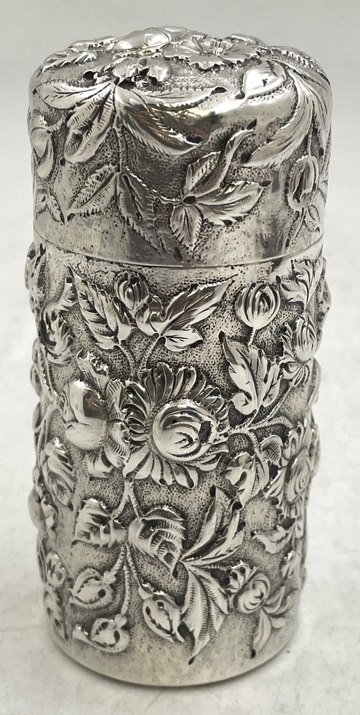 S. Kirk & Son & Co. sterling silver besamim spice box in repousse pattern, adorned with floral and natural motifs, made between 1903 and 1907. It measures 4'' in height by 1 3/4'' in diameter at the base, and bears hallmarks and a monogram at the base as shown.