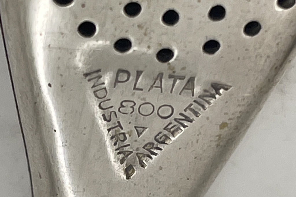 Argentinian 0.800 silver and wood mate cup with a straw (marked 18k at the top as shown) with floral and geometric motifs. The cup measures 4'' in height by 1 1/8'' in diameter at the top (overall depth is 2 3/4'' approximately) while the straw measures 7 3/4'' in length. Hallmarks are shown.