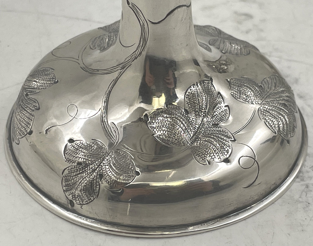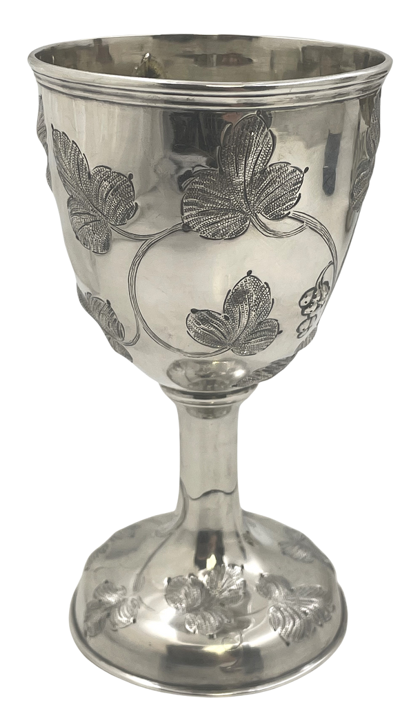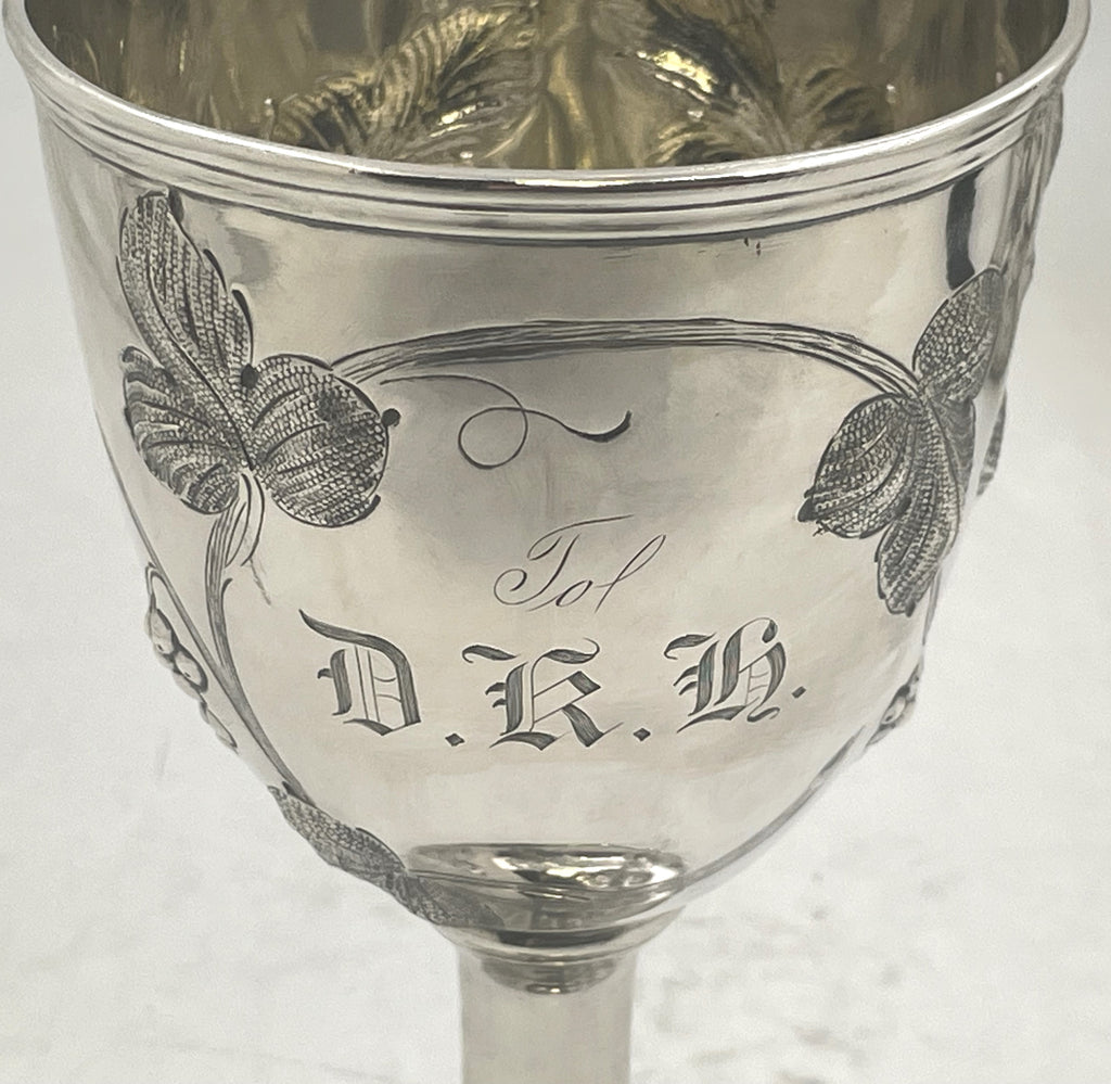 Eben Cutler, coin silver goblet from the 19th century adorned with vine-like motifs, faintly gilt inside. It measures 6 1/8'' in height by 3 1/2'' in diameter at the top, weighs 4.6 troy ounces, and bears hallmarks as shown. This goblet could serve well as a Kiddush cup.