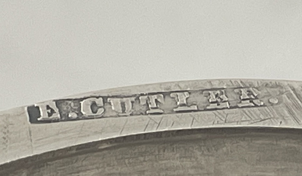 Eben Cutler was born in 1816 in Warren, MA. He became a silversmith and jeweler. He was a partner in 1839-1842 with Amos Cutler in Boston MA as A. & E. CUTLER. One of Amos Cutler's pieces is in the permanent collection of the Museum of Fine Arts in Boston. Eben Cutler died in 1889 in Boston.