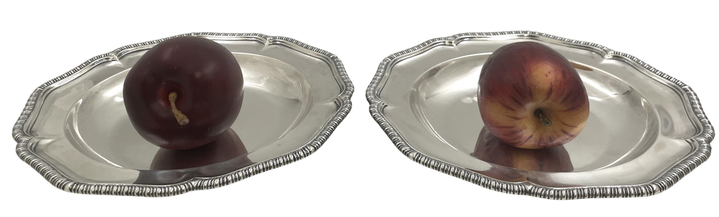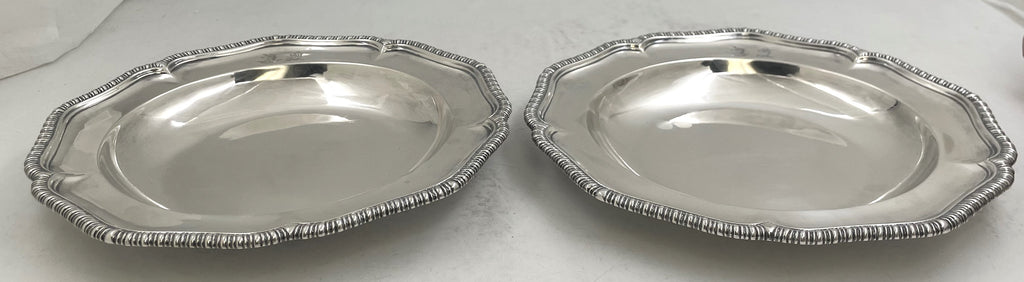 Pair of Paul Storr sterling silver serving dishes from 1807 (Georgian era) in heavy gage with a gadrooned rim. They measure 9 1/2'' in diameter (6 5/8'' excluding the rim) by 1 1/8'' in height, weigh 38.6 troy ounces, and bear hallmarks and a coat of arms as shown.