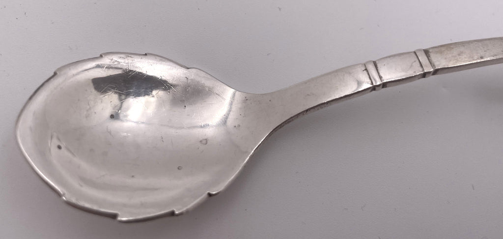 Georg Jensen sterling silver beautifully hand-hammered pea in a pod jam serving spoon, adorned with stylized geometric motifs, and in pattern number 41 from the early 20th century. It measures 4 1/2'' in length and bears hallmarks as shown.