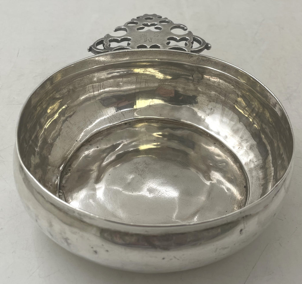 Edward Winslow rare silver porringer from the early 18th century. It measures 7 1/2'' in depth including the handle by 5 1/8'' in width by 1 7/8'' in height, weighs 7.8 troy ounces, and bears hallmarks as shown. The handle is adorned with the monogram M S E and the piece shows rare 18th century repairs at the base.