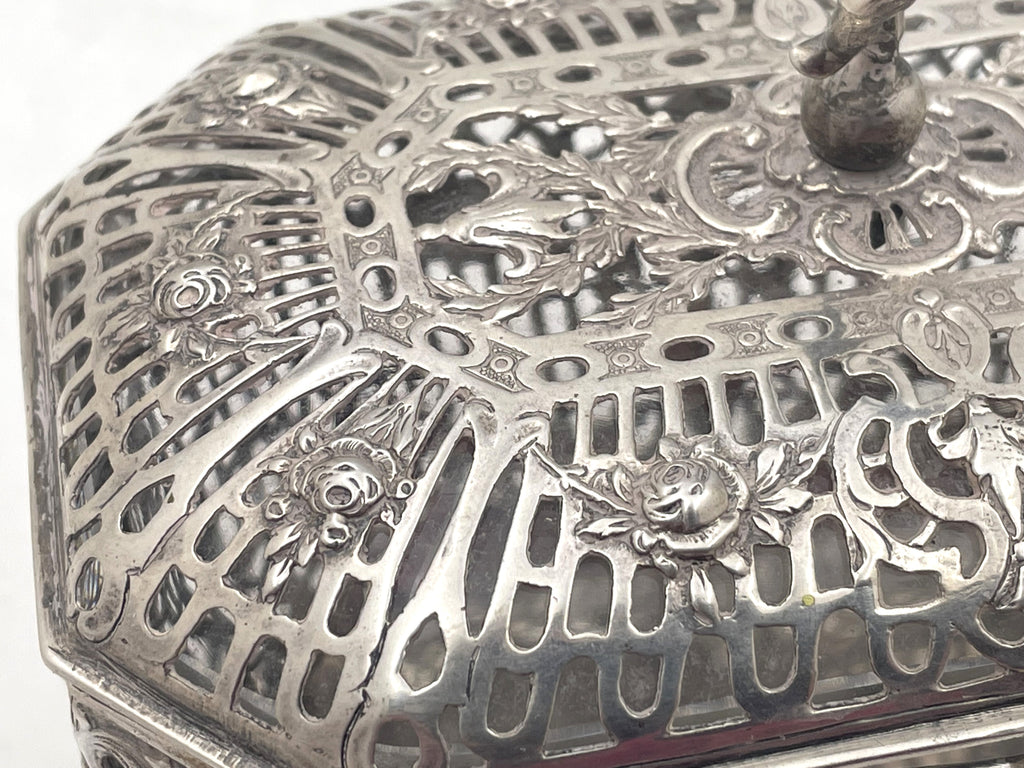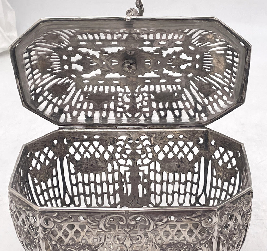 German, continental 0.800 silver casket, beautifully adorned with a putti on top, with pierced geometric and floral motifs. There is glass inside the top part of the casket. It measures 5 1/3'' in length by 3 1/2'' in width by 4 3/4'' in height and bears hallmarks as shown. Gross weight is 14.8 troy ounces.