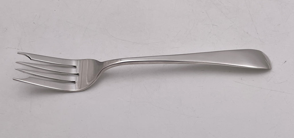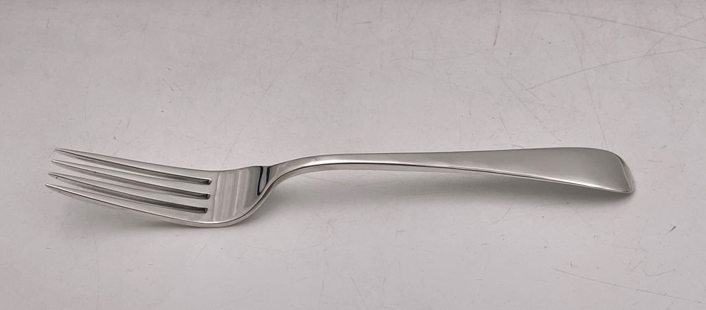 The hammering doesn't end when the piece is forged to shape; it is rehammered with a lighter planishing hammer to smooth out the heavy forging marks, leaving a subtle hammered texture. The hand-forged sterling silver flatware uses many of the same tools and techniques that existed in silversmith shops in the 1700s.