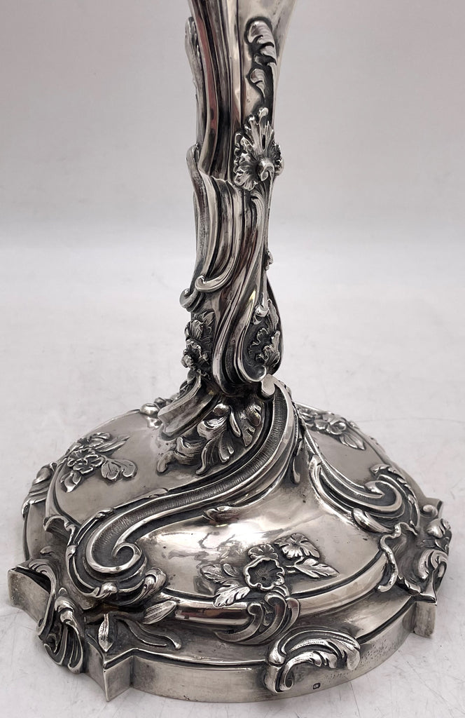 Pair of Fouquet-Gueudet, French 0.950 (higher purity than sterling) silver 4-light candelabra made, circa 1865, richly adorned with stylized natural and floral motifs. They measure 19 1/2'' in height by 13'' from arm to arm, weigh an impressive 184 troy ounces, and bear hallmarks as shown.