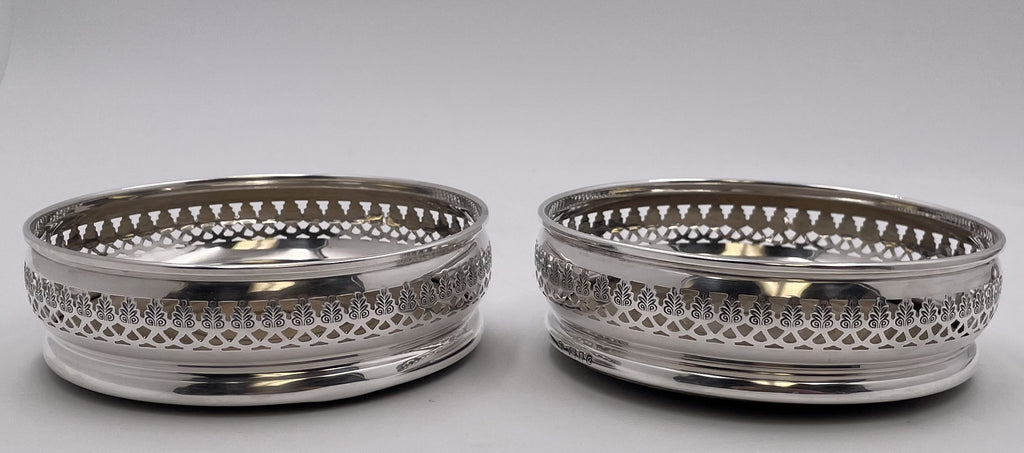 Pair of English sterling silver and wood coasters, made in London in 1969, with pierced geometric motifs. They measure 5 1/2'' in diameter by 1 2/3'' in height and bear hallmarks as shown.