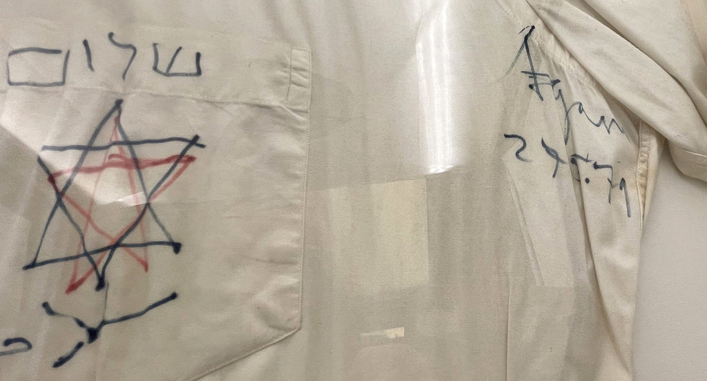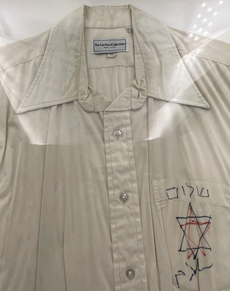 Unique Yaacov Agam shirt (signed and dated) with a Star of David. The framed dimensions are 28 1/2'' by 30 1/2''.