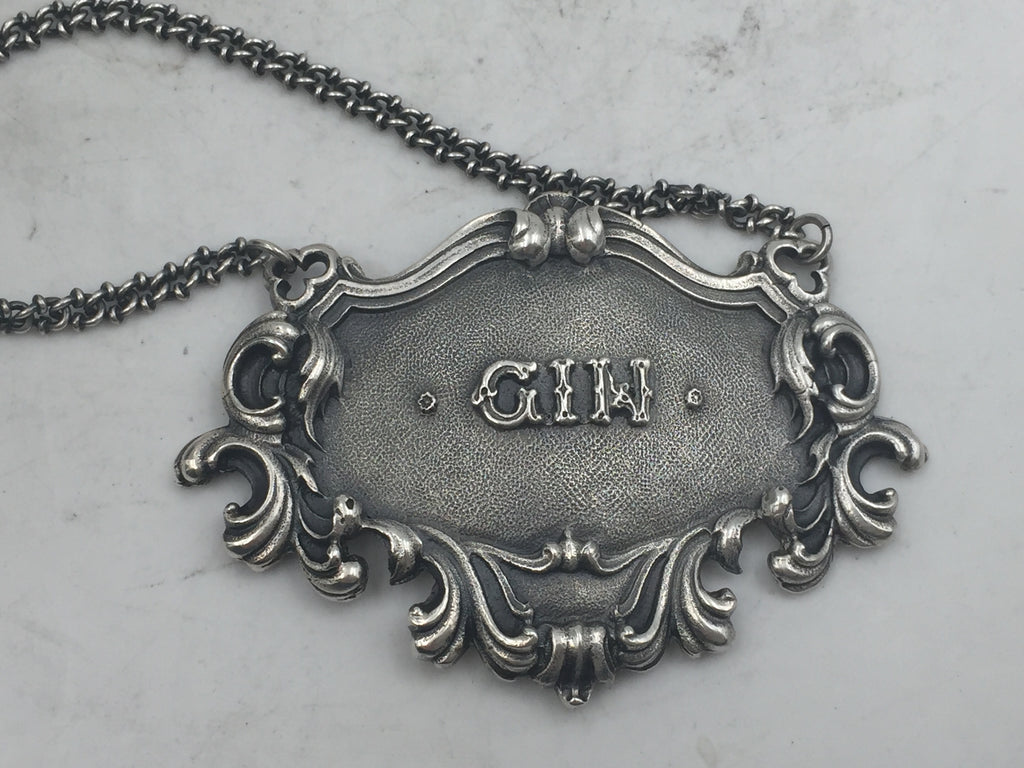 Rare Buccellati sterling silver claret bar jug label. GIN embossed on the front in the center.