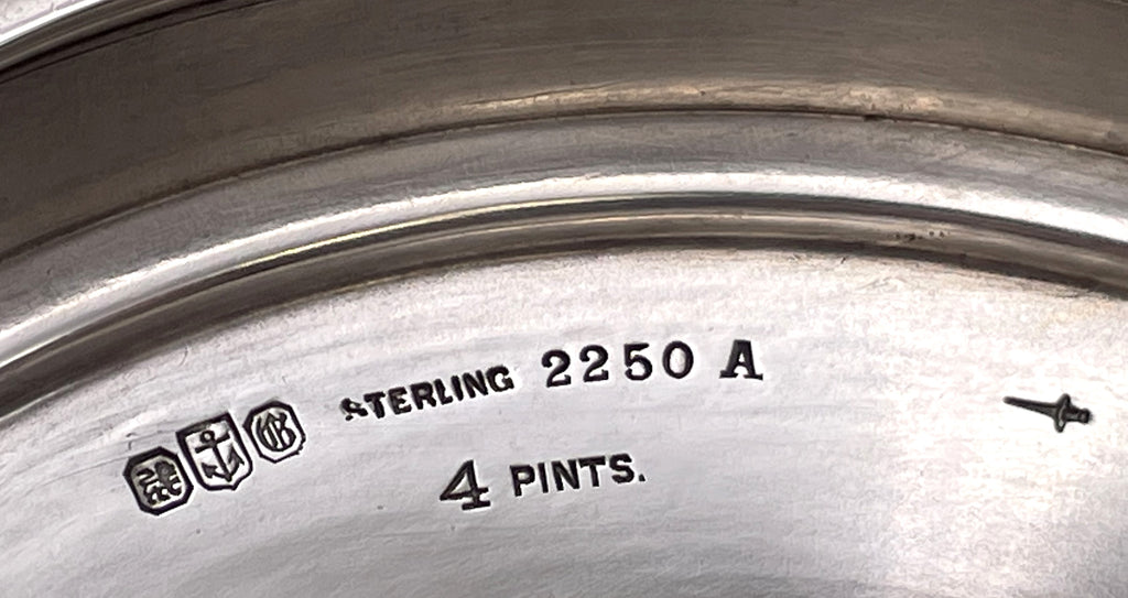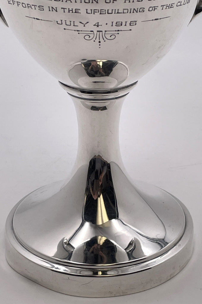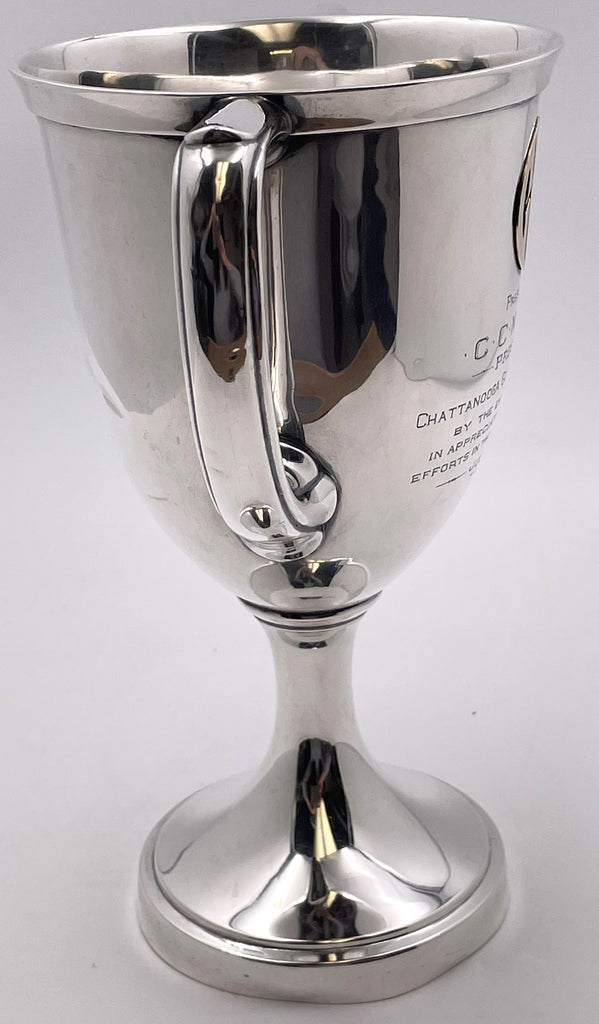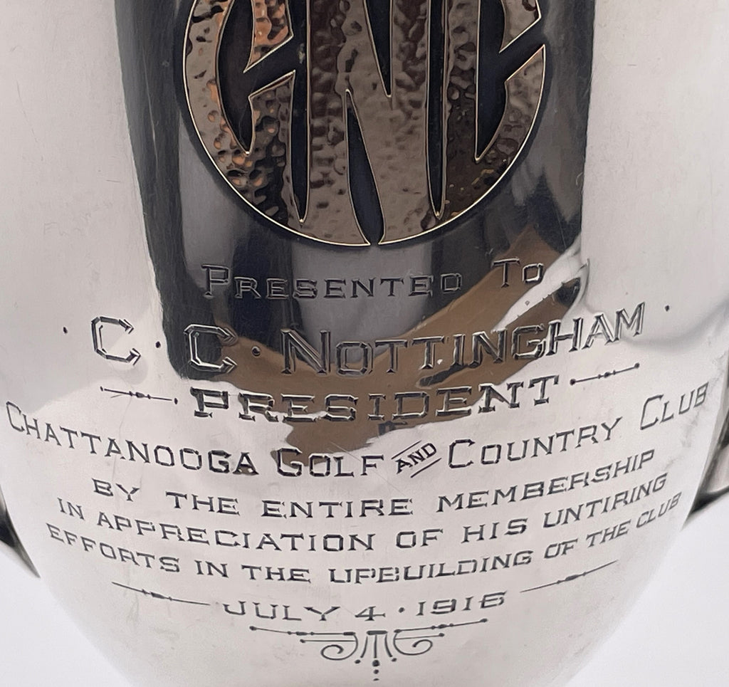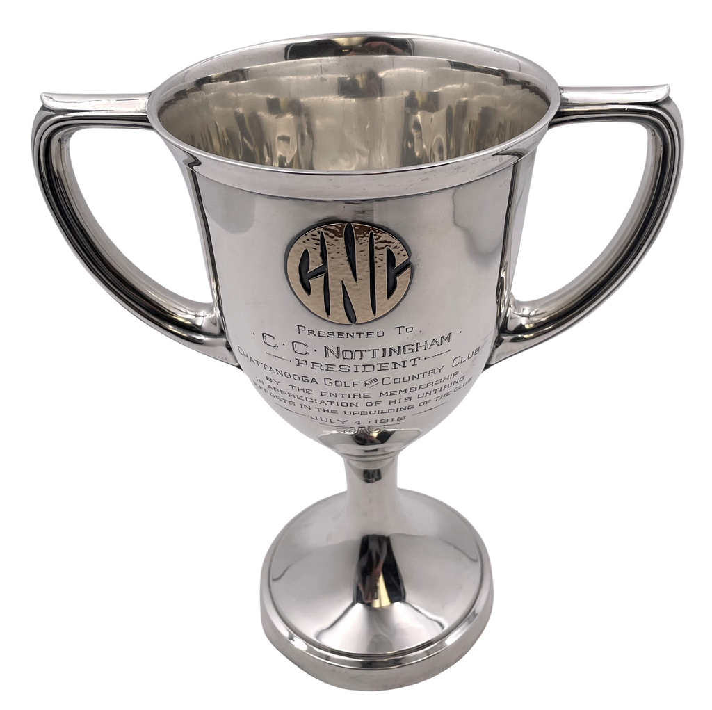 Gorham sterling silver 2-handled trophy cup, with an applied 14 karat gold monogram, in pattern number 2250A and from 1915, adorned with an engraved dedication to C. C. Nottingham, the President of the Chattanooga Golf and Country Club. It measures 11'' in height by 10 1/4'' from handle to handle by 6 1/4'' in depth (i.e., the diameter at the top), weighs 22.1 troy ounces, and bears hallmarks as shown.