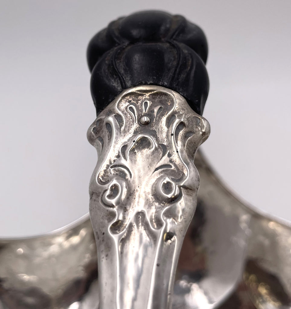Posen German 0.830 silver wine caddy or basket bowl, beautifully hand-hammered, standing on 4 wood feet, from the late 19th or early 20th century. It measures 9 1/2'' in height (4 1/2'' excluding the handle) by 13'' in depth by 8 1/4'' in width, weighs 19.7 troy ounces, and bears hallmarks as shown.
