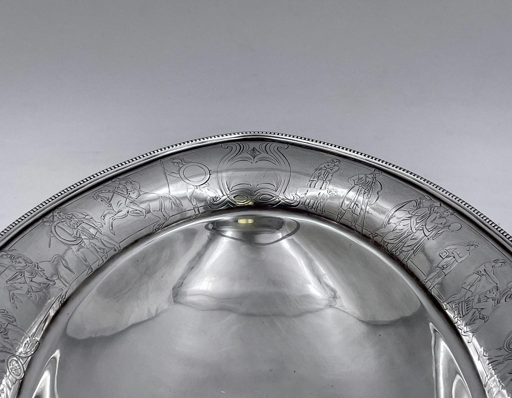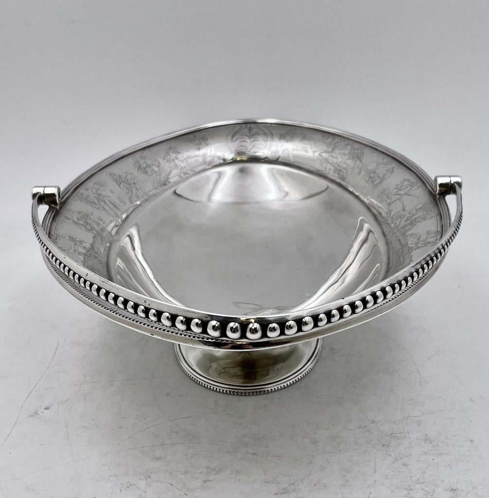 Roberts & Belk sterling silver centerpiece basket from 1867 in Victorian style with finelly engraved mythological frieze around the rim with a beaded handle, measuring 12 1/2'' in length by 9'' in width by 3 1/2'' in height (11'' total with the lifted handle). It weighs 28.3 ozt and bears hallmarks as shown.