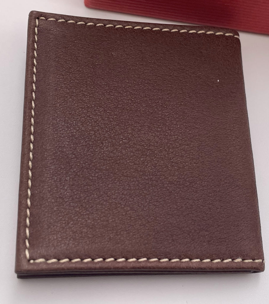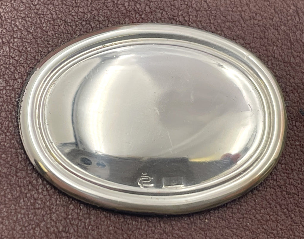 Cunill leather holder for 2 photographs, with a sterling silver applied oval motif. It measures 2 3/4'' by 2 1/2'' and is sold new in its original box.