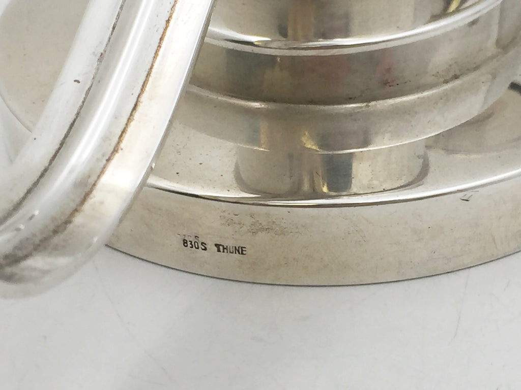 N.M. Thune, Norwegian 0.830 silver pair of 2-light candelabra in Mid-Century Modern style reminiscent of the work of the great silversmith Georg Jensen. With its elegant proportions and curvilinear designs, including a frieze of stylized motifs at the center, each measures 12 1/2'' from bobeche to bobeche by 4 3/4'' in base diameter by 5'' in height and bears hallmarks as shown. Total weight is 39 troy ounces.