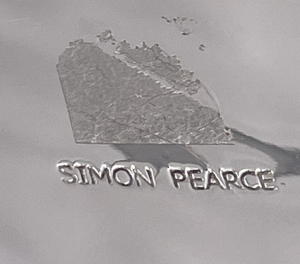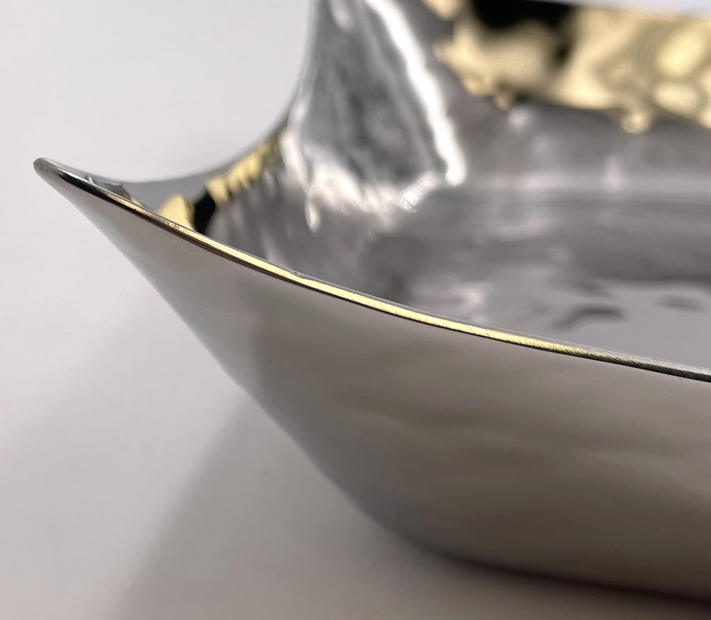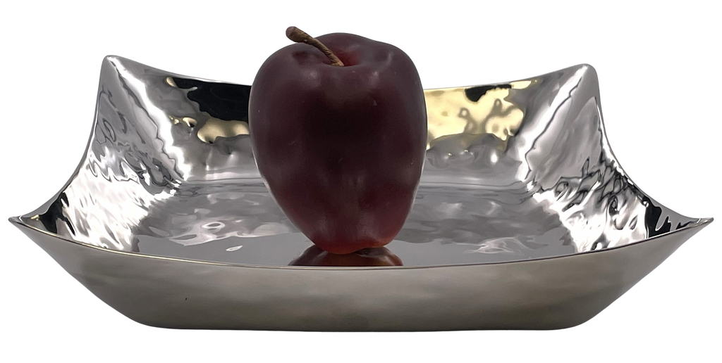 Simon Pearce silverplate centerpiece dish, beautifully hammered, in an elegant, geometric design. It measures 9 7/8'' by 9 7/8'' by 2 1/4'' and bears hallmarks as shown.