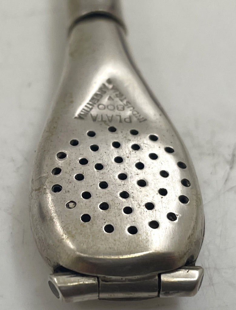 Argentinian 0.800 silver and wood mate cup with a straw (marked 18k at the top as shown) with floral and geometric motifs. The cup measures 4'' in height by 1 1/8'' in diameter at the top (overall depth is 2 3/4'' approximately) while the straw measures 7 3/4'' in length. Hallmarks are shown.