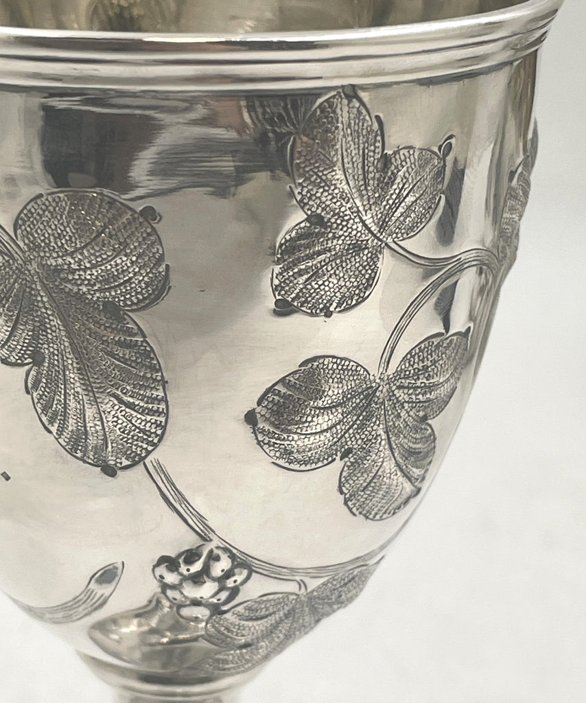 Eben Cutler, coin silver goblet from the 19th century adorned with vine-like motifs, faintly gilt inside. It measures 6 1/8'' in height by 3 1/2'' in diameter at the top, weighs 4.6 troy ounces, and bears hallmarks as shown. This goblet could serve well as a Kiddush cup.