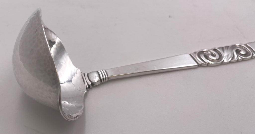 Georg Jensen sterling silver gravy ladle, beautifully hand-hammered, in the celebrated Scroll pattern, with an elegant, geometric design. It measures 7 7/8'' in length, weighs 3.1 troy ounces, and bear hallmarks as shown.