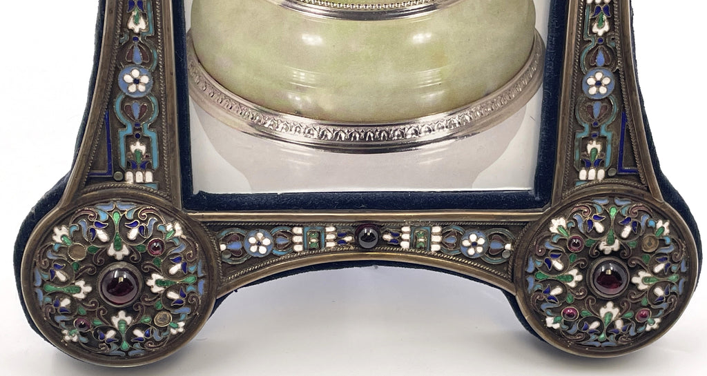 Russian 0.84 silver and enamel set of 3 matching picture frames, from the late 19th century. With exquisite enamel work and felt in the back, they measure 8 2/3'' in height by 6 3/4'' in width by 3/4'' in depth (photo size is 3 3/4'' by 5 1/8'') and bear hallmarks as shown.