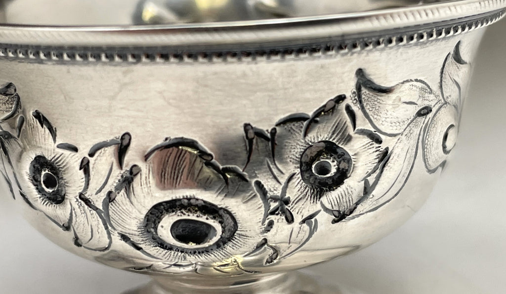 Pair of Gorham, coin silver open salt cellars, made circa 1855 to 1860, beautifully adorned with floral and cartouche motifs. They measure 2 1/2'' in diameter by 1 2/3'' in height, and bear hallmarks and a monogram as shown.
