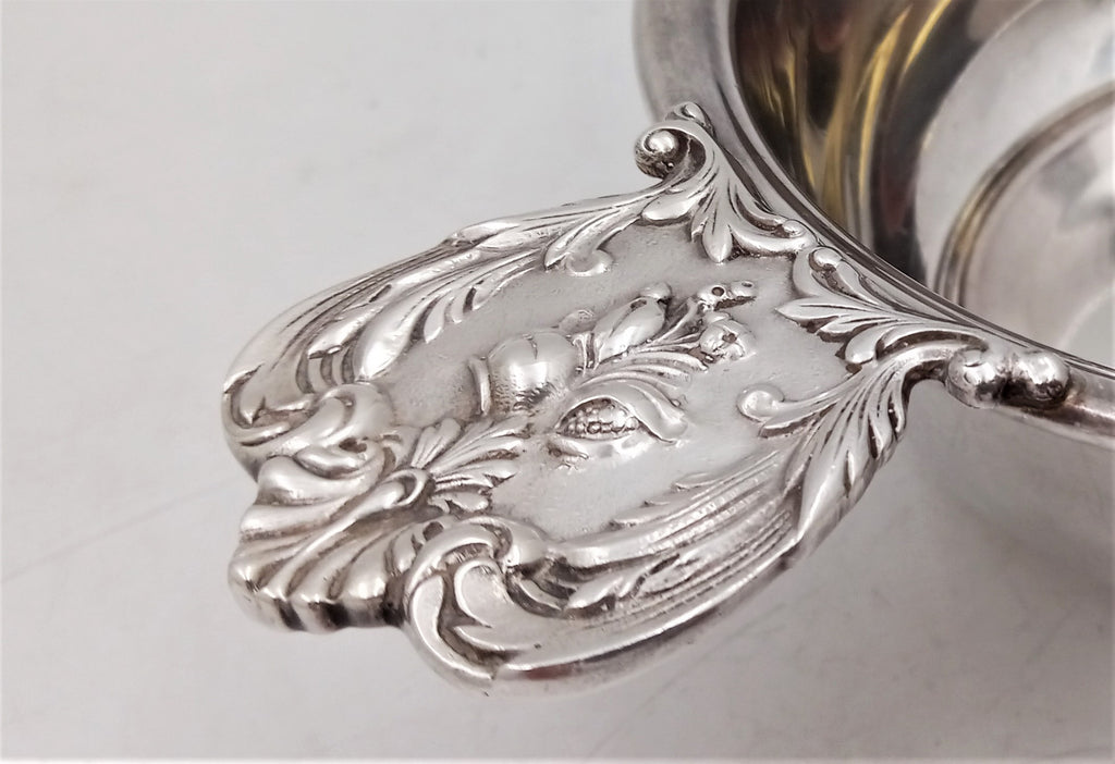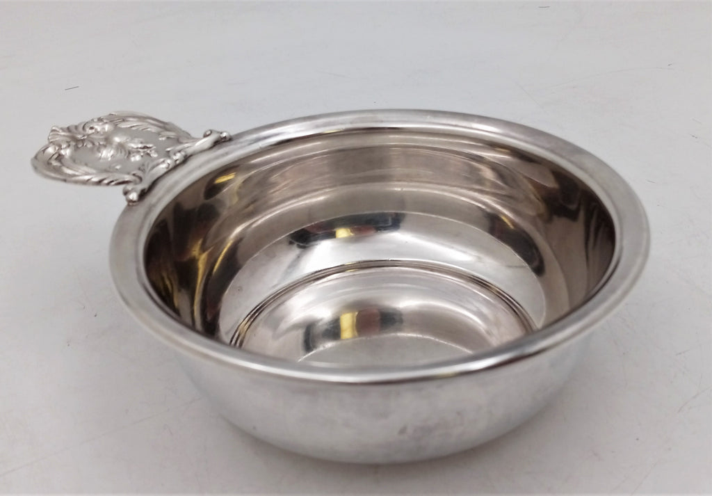 Reed & Barton sterling silver porringer bowl in celebrated Francis I pattern and in Art Nouveau Style in pattern X569 from 1955, measuring 6 1/2'' in length (including the handle) by 4 3/4'' in diameter by 1 3/4'' in height, weighing 4 troy ounces, and bearing hallmarks as shown.