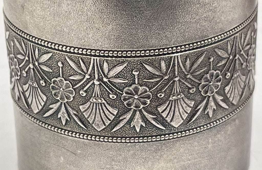 Wood & Hughes sterling silver napkin ring holder, from the 19th century, with raised stylized motifs as well as an engraved monogram and inscription dated from 1884 It measures 1 3/4'' in diameter by 1 3/4'' in height, weighs 1.5 troy ounces, and bears hallmarks as shown.