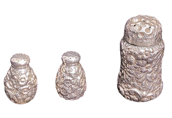 Shiebler Sterling Silver Repoussé Set of 3 Salt, Pepper, and Sugar Shakers from the late 19th Century