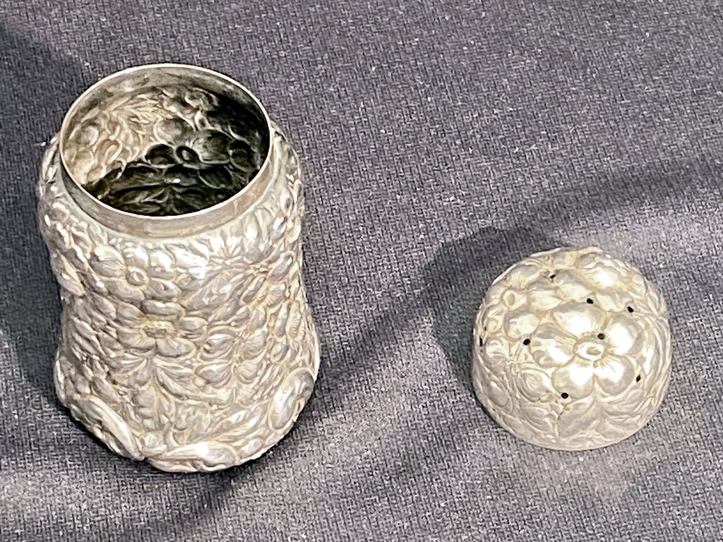 Comes with a sterling silver sugar shaker / muffineer with a floral daisy motif in repousse style. Measures 6 1/4 inches tall and weighs 3.5 troy oz. Stamped with a 2 but has no makers mark. Bearing hallmarks as shown. All are from the late 19th century.