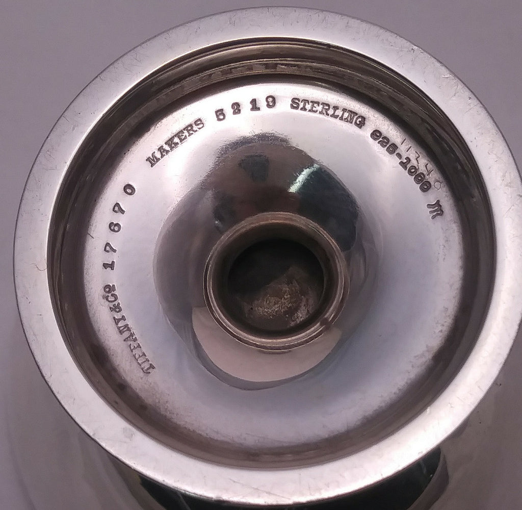 Two Tiffany sterling silver salt cellars, with gold wash. Each measures 2" high x 2 1/2" wide. Bearing marks as shown.