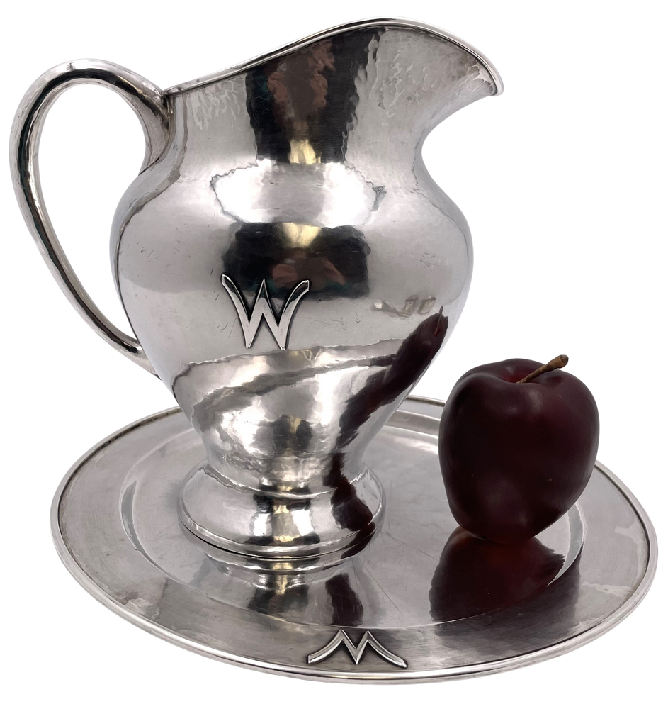 Falick Novick, sterling silver handwrought (hand-hammered) sterling silver pitcher on a matching tray, in Chicago Arts & Crafts style, with an elegant, geometric design, from the early 20th century. The pitcher measures 9 3/4'' in height by 9 1/2'' from handle to spout, while the tray measures 12'' in diameter by 3/4'' in height. Hallmarks and a monogram are shown. Total weight is 57.3 troy ounces.