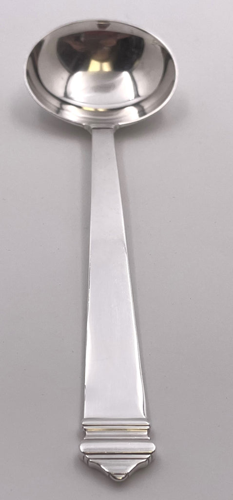 Tiffany & Co. sterling silver sauce ladle in the Hampton pattern, and in Art Deco style. It measures 7 1/2'' in length by 2 1/2'' in width by 7/8'' in height, weighs 3.2 troy ounces, and bears hallmarks as shown.
